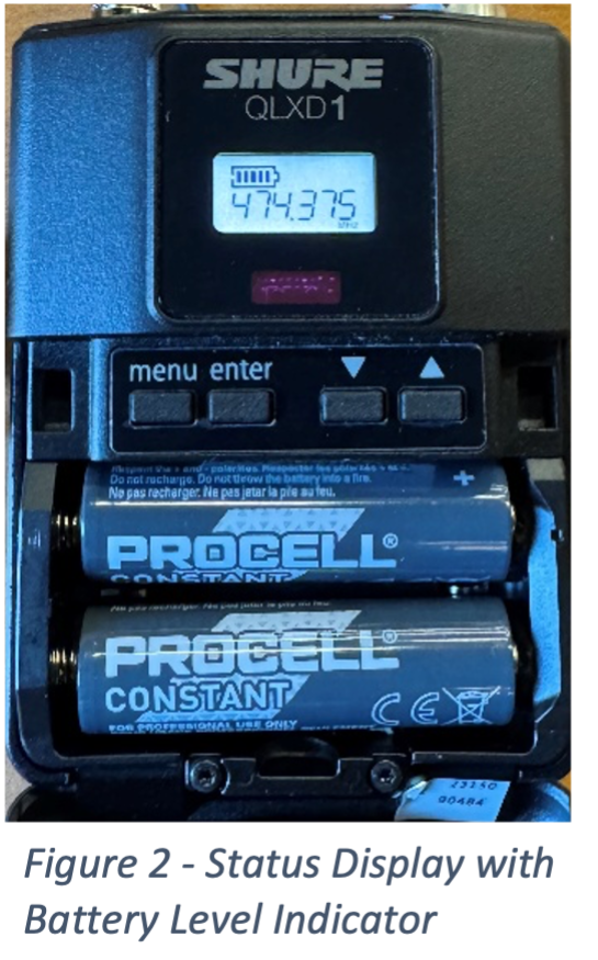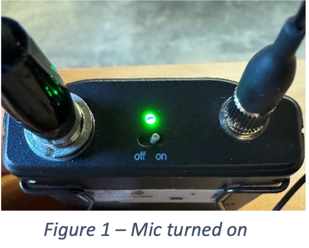- Locate the microphone and flip the power switch to the ‘On’ position. A green light will appear to indicate the transmitter is powered on, and the display on the face of the transmitter will light up (Figure 1).
