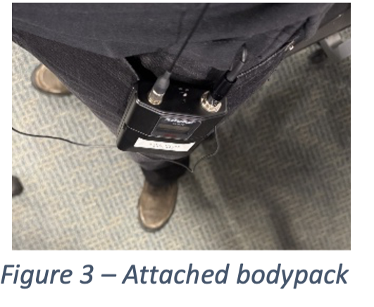 Attach the bodypack to your waistband, pocket, or another comfortable position on your body (Figure 3). Clip the