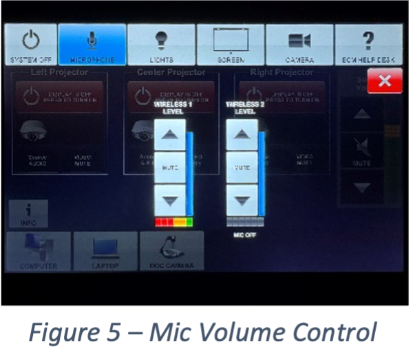 Use the control panel to adjust the microphone volume. Ensure the microphone is not muted. As you speak into the microphone, you should hear your voice amplified in the room. If you do not hear yourself, your voice is not being included in the recording. Once you have ensured that your voice is passing through the system, you may adjust the level to your preference.