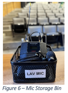 For classrooms with Panopto lecture recordings, you must wear the room-specific microphone, found in the bin labeled ‘Lav Mic’ on the lectern, as shown in Figure 6. If the microphone is missing, contact the ECM Help Desk immediately.